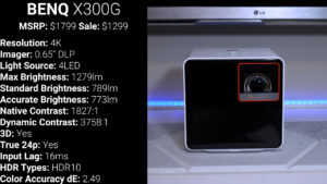 After that with an MSRP of $1799 and a common sale price around $1299 is the 4K BENQ X300G. BENQ claims that the X300G’s 4LED light source can output 2000 ANSI lumens, but in my testing, it came in significantly below that at 1279 ANSI lumens on its not particularly color accurate Bright mode and just 789 lumens on the more standard FPS mode. On its most color accurate Cinema mode with the light source set to normal, it measured 83.3 nits, which is around 760 lumens, but had an impressively low black floor of 0.046 nits for a native contrast ratio of 1827:1. Setting the light source to Dynamic yielded a slightly higher peak brightness of 84 nits while cutting the black floor in half at an impressive 0.022 nits for a dynamic contrast ratio of 3758:1.
