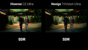 So Round 8 put the Hisense C2 Ultra on the left and the Nexigo TriVision Ultra on the right. The Hisense C2 Ultra is the first projector since the BENQ in Round 1 to have dynamic dimming for a lower black floor in the darkest scenes. That’s encouraging since the C2 Ultra also looked fantastic in bright and moderately lit SDR content, with brighter highlights and more shadow detail in areas like the trees on the left, and in the absolute darkest scenes the dynamic dimming on the Hisense C2 Ultra came through, lowering the black floor significantly compared to the Nexigo, leading to a much more contrasty image while preserving shadow detail. I’ll be honest, this was the first “oh wow” moment I had while shooting this video, because the Hisense C2 Ultra looked absolutely excellent. However, in Dolby Vision content, the C2 fell a little flat. It’s not that it didn’t look good, it just didn’t look as good as I was expecting, and dark scenes didn’t seem to be getting the same amount of dynamic dimming as in SDR. In about half the scenes, I thought that the Nexigo TriVision Ultra actually performed better than the C2 Ultra, but I felt that the dynamic dimming performance of the Hisense, combined with very solid performance in bright and moderately lit scenes earned it the win in this round, even though the scene in the auto exposure test was too brightly lit for the Hisense dynamic dimming, resulting in the Nexigo actually having the lower black floor about half the time.