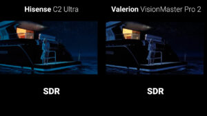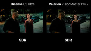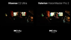 And that means that the final round is the Hisense C2 Ultra on the left and the Valerion Vision Master Pro 2 on the right. In bright SDR content these two projectors were basically indistinguishable from each other. But in moderately lit scenes, the Valerion’s Enhanced Black Level mode absolutely mopped the floor with the Hisense High Dynamic Mode, not only increasing contrast and lowering the black floor, but occasionally I could see the Hisense step its laser power up or down in the middle of a scene, but I never noticed pumping or dramatic shifts in the Valerion’s laser brightness. Most importantly, the Valerion kept dark scenes dark while preserving shadow detail, while the Hisense C2 needed to brighten the entire scene to maintain the same level of contrast.