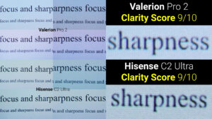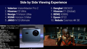That means that the final rankings for viewing experience had the Valerion Pro 2 on top by what I thought was a significant margin, followed by the Hisense C2 Ultra which seems to have the hardware to compete, but weak software, and the Nexigo TriVision Ultra in third which seems to have the opposite problem with great tone mapping and firmware, but no dynamic dimming support with its ALPD 5.0 light source.
