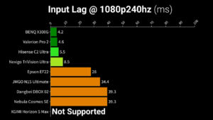 At 1080p120Hz, only the BENQ, Valerion, Nexigo, and Hisense improved their input lag from their 4K60Hz numbers with the BENQ only missing the theoretical minimum by 0.1 ms, and at 1080p240Hz those same four projectors improved, with the BENQ hitting the 240 Hz theoretical minimum of 4.2ms, while the XGIMI Horizon S Max didn’t support 240 Hz input at all.