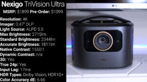 The Nexigo TriVision Ultra was the other standout in this video, based strictly on its price versus performance ratio. 2400 usable ANSI lumens with 1550:1 native contrast ratio and 95% DCI-P3 color space coverage for the $1099 pre-order price is unheard of, and even at a full MSRP of $1899 it would still be the best value of anything currently on the market.