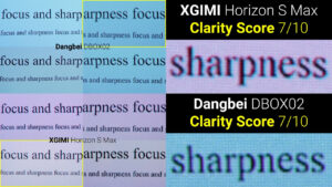 The Dangbei DBOX02 and XGIMI Horizon S Max had a single corner with soft focus and more extreme chromatic aberration than the Hisense and Valerion earning 7 points each, and the Nebula also earned 7 points, with soft focus in two corners, but the least color fringing of any of the projectors in the video.