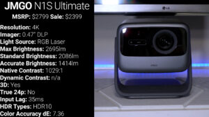 Jumping past the $2000 price point we’ve got the JMGO N1S Ultimate with an MSRP of $2799 but a common sale price of $2399. The N1S Ultimate is JMGO’s current flagship and pushes its MALC triple laser light source to output a claimed 3500 ANSI lumens, but unfortunately my N1S Ultimate fell way short of that at just 2695 ANSI lumens with the Ultra Brightness option engaged, and 2086 ANSI lumens in standard picture mode. In its most color accurate movie mode, the N1S Ultimate measured just 153.7 nits or around 1410 lumens with a black floor of 0.147 nits for a native contrast ratio of 1029:1, and unfortunately like the XGIMI and Nexigo, the JMGO N1S Ultimate also doesn’t have any Dynamic contrast options.