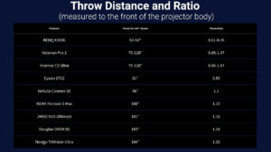 Throw ratio and aiming solutions may also be important for your space and here are the measured throw distances required for each projector to produce a 100” diagonal image with some notable differences being the short throw of the BENQ X300G, and the 1.2x optical zoom of the Valerion, Hisense, and BENQ which give them a bit of flexibility in placement without sacrificing resolution. But be aware that they will have slightly higher brightness at their minimum throw distance and slightly higher contrast at their maximum throw distance.