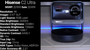 After that with an MSRP of $2999 and a common sale price of $2499 is the Hisense C2 Ultra which has the latest generation of RGB laser light source which Hisense says can put out 3000 lumens, but in my testing, it only measured 2690 ANSI lumens with the picture mode on Dynamic and the brightness enhancer set to Ultra. Without the brightness enhancer, that number fell to 2348 ANSI lumens. On Cinema Day with dynamic dimming on, it measured 170.2 nits which is around 1570 lumens, but with a black floor of 0.026 nits for an awesome dynamic contrast ratio of 6436:1, while the native contrast ratio on the C2 Ultra was 1688:1, and both of those contrast values are VERY impressive for a bright DLP projector.