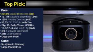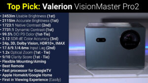 The Valerion had the highest usable brightness, the highest color accurate brightness, the second highest native contrast, and by far the highest dynamic contrast. It covers 99.5% of the DCI-P3 color space with an SDR color accuracy of 3.12 average delta error. It supports 24p, all types of 3D, Dolby Vision, and IMAX enhanced, it has exceptionally low input lag, 1.2x optical zoom, great clarity, great auto focus and keystone, a built in aiming kickstand and optional gimbal mount, a useful remote, snappy processor for its GoogleTV operating system, and most importantly, it finished first in the side-by-side viewing experience testing. Honestly, the final round versus the Hisense C2 Ultra wasn’t even close.
