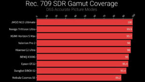 For SDR content in the Rec 709 color space most of the projectors performed almost equally with the single laser projectors from Epson, Dangbei, and Nebula performing the worst. Moving into the larger HDR DCI-P3 color space, the differences became more pronounced with the triple laser projectors from Hisense, JMGO, and Valerion performing the best, followed by the hybrid light sources from XGIMI and Nexigo, and then the single lasers and LED projectors were at the bottom.