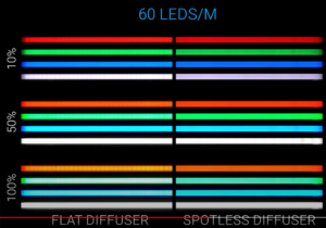 Starting out with 30 LEDs per meter, we’ve got the bare aluminum deep channel with flat diffuser on the left and the same bare aluminum deep channel with the spotless diffuser on the right. At 50% and 100% brightness the spotless diffuser doesn’t disappoint and gives as close to a spotless look as you can get with a 30 LED per meter strip. Switching it out for 60LEDs per meter the spotless diffuser lives up to its name again giving us the first time we’ve seen a completely spotless look through all the colors and brightness levels. Unfortunately, the spotless diffuser isn’t available to purchase with a shallow aluminum channel, but for comparison’s sake here’s what that combination looks like at 30 and 60 LEDs per meter, which although not perfect is a huge improvement over the flat diffuser.