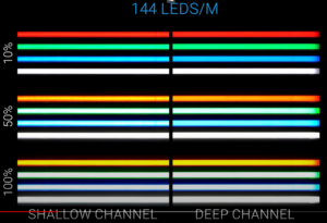 Starting out with 30 LEDs per meter you can see the shallow channel on the left and the deep channel on the right and as we would expect, the deep channel does a significantly better job diffusing light at each brightness level, but the dots are still visible. At 60LEDs per meter the deep channel is really close to achieving the perfectly diffuse look, and at 144 LEDs per meter all the hotspots are gone. So for the most diffuse look there’s no question that deep channels are significantly better than shallow channels but there is a drawback. I also measured the drop in brightness compared to no diffuser at all, and on average the deep channel led to a 36% drop in brightness vs only 22% for the shallow channel, so if you’re just looking for a channel to conceal or mount your LEDs and they won’t be directly visible than shallow channels are the way to go.