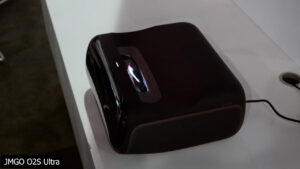 JMGO also had a new 4K ultra short throw called the O2S Ultra, which has 3000 ISO lumens from a MALC triple laser light source, but the two most interesting things to me were its extremely small size and a feature JMGO called an electrical micro gimbal. The gimbal allows for automatic vertical adjustment of the screen, which could ease the difficulties associated with ultra short throw screen alignment but there was no demo of that feature happening in the booth. JMGO says we can expect the O2S Ultra to launch in Q3 of 2025.