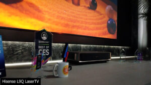 Hisense also had a mini UST that there was almost no info on called the Hisense Compact Laser TV with 4K resolution, 3000 ANSI lumens, and auto screen fit. But the big projector news at Hisense was their new flagship L9Q laser TV that has some absolutely ridiculous brightness specs, reaching 1500 nits by pairing the 4000 lumen projector with a 2.9 gain Fresnel screen, and those 1500 nits would make it on par or brighter than almost all the large format TVs on the market. But that highest brightness likely only applies to the 100” version, while the L9Q LaserTV will have five different projector and screen bundles ranging from 100-150 inches, but as is normal for Hisense, pricing and release dates weren’t available at CES.