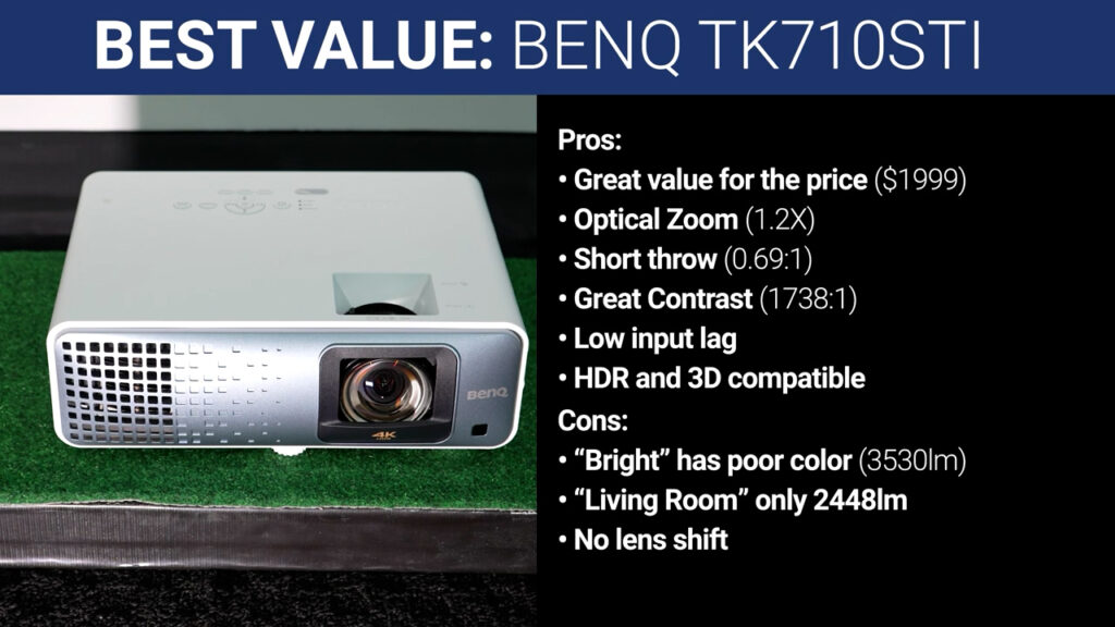 The new Optoma ZK608TST is the best all-around golf sim projector money can buy. It’s got 5879lm of peak brightness in “Bright” mode with less than ideal but still usable color accuracy, and 4600lm in “Vivid” mode with vibrant and accurate colors. It has one of the shortest throw distances I’ve ever seen as well as optical lens shift and digital image shift. It’s quiet, dust proof, has a relatively low power draw for its brightness, a very high native contrast ratio, supports HDR content and 3D, has low input lag, and it’s just barely larger than a typical home theater projector. The only downsides I can see are that it doesn’t have any optical zoom and at $5999 it’s not going to fit most people’s budget.