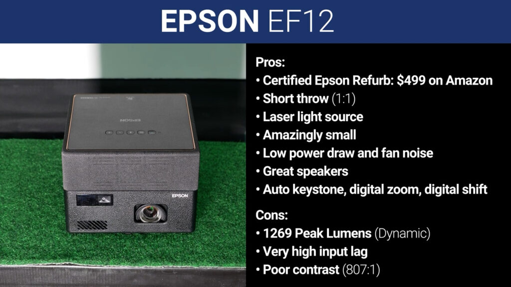As for the Epson EF12, it is what it is. If your budget is $500 and you want a very usable short throw projector that’s easy to set up, has a long lasting laser light source, is super small, has low power draw, great speakers, and good digital zoom image shift options, the EF12 works. But don’t expect much wow factor and be prepared to play with most of your lights off.