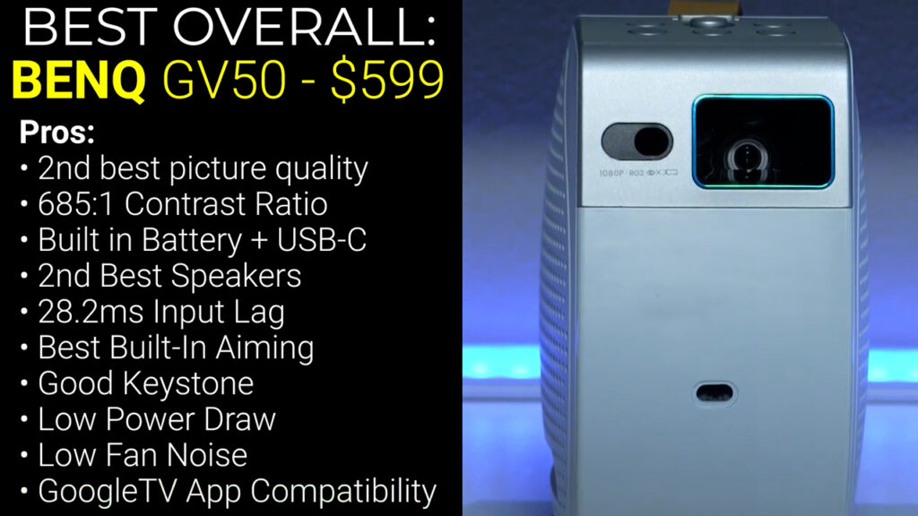 If I had to pick one projector to do it all, the BENQ GV50 is an easy pick. It’s got great picture quality, 500 lumens of usable brightness, a 685:1 contrast ratio, a built in battery with nearly 2 hours of unplugged playback, plus the ability to extend that using a power bank via USB-C. It’s got great speakers, low input lag, an awesome built in aiming system, good keystone, low power draw, low fan noise, and great app compatibility, and at $599 it doesn’t completely break the bank, and I honestly don’t have anything bad to say about it, other than I guess it could be brighter.