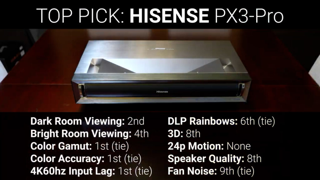 The real standout, and the projector that I’ll personally be switching to, is the Hisense PX3-Pro which finished 2nd for dark room viewing, and 4th for bright room, but suffered in the overall not passing the RTING 24p test and 3D that’s definitely not working correctly yet, and I’d never suggest buying a product based on updates that may or may not happen, but it seems like both of those things could easily be fixed in a firmware update.