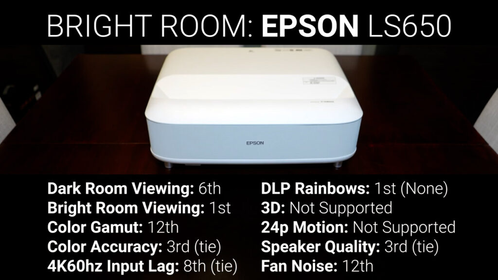 For purely bright room viewing, the Samsung LPU9D came out slightly on top of the LS650. If you’re made of money and bright room performance is all you care about then you should go for the Samsung, but at less than half the price of the Samsung, there’s a lot to like about the LS650 which is also $500 cheaper than the LS800 that I tested last year but was actually brighter in dynamic mode according to my measurements. Combine that with good speakers, decent input lag, and zero rainbow effect and the LS650 makes for the perfect man-cave projector for watching big screen sports. The biggest difference between the LS650 and LS800 is their throw distance where the LS800 needs just 4.5” from the wall for a 100” screen vs 11.5” for the LS650, but the less extreme throw does make it easier to lineup the LS650 without keystone. So, if you’re looking for a light cannon to watch sport, pick whichever Epson has a better throw distance for you.