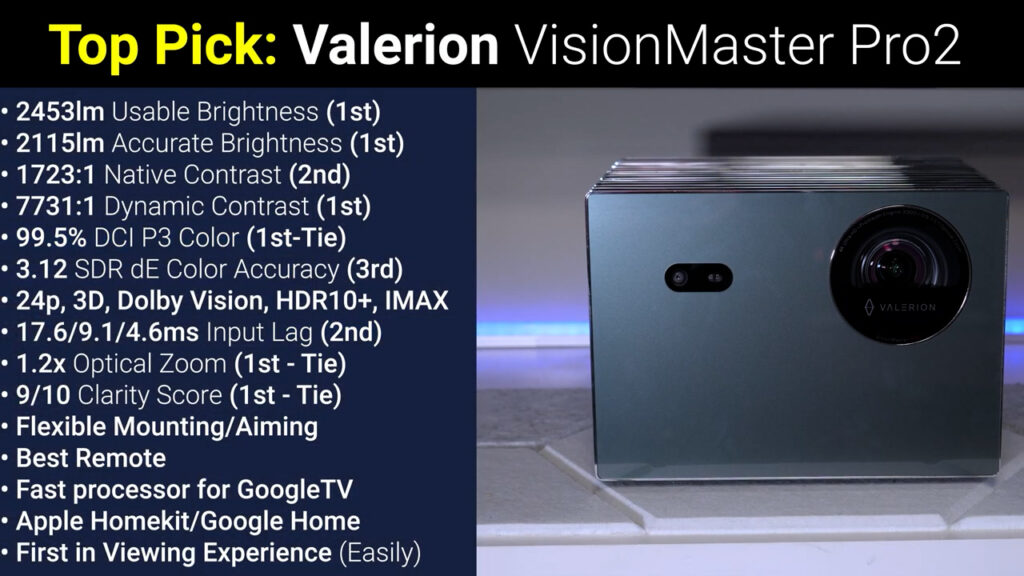 The Valerion Vision Master Pro 2 has basically no weaknesses. I’ve reviewed hundreds of projectors, and I can usually find something wrong with them, but other than some maybe overzealous contrast claims that are only achievable with full black and white patterns, the Valerion is absolutely exceptional. The Valerion had the highest usable brightness, the highest color accurate brightness, the second highest native contrast, and by far the highest dynamic contrast. It covers 99.5% of the DCI-P3 color space with an SDR color accuracy of 3.12 average delta error. It supports 24p, all types of 3D, Dolby Vision, and IMAX enhanced, it has exceptionally low input lag, 1.2x optical zoom, great clarity, great auto focus and keystone, a built in aiming kickstand and optional gimbal mount, a useful remote, snappy processor for its GoogleTV operating system, and most importantly, it finished first in the side-by-side viewing experience testing. Honestly, the final round versus the Hisense C2 Ultra wasn’t even close.