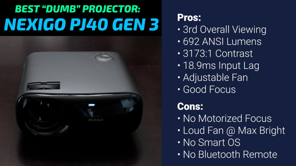 However, all three of those projectors use the NetRange store and operating system, which other than full Netflix support leaves a lot to be desired. I want to make another argument for just getting a projector with no smart OS and adding a FireTV stick or Roku for streaming. The Nexigo PJ40 Gen 3 finished third overall for viewing experience with 692 ANSI lumens and 3173:1 contrast ratio, and importantly if you want to play video games, it also has a game mode with less than 20ms of input lag. The PJ40 has an adjustable fan, which is admittedly very loud at max brightness measuring in at close to 49 decibels, but the fan can be adjusted down along with the maximum brightness of the light source, and it can get all the way down to 34.7 decibels if that’s what you’re going for. At maximum brightness, the PJ40 draws 150.5 watts to output 692 lumens for an efficiency of 4.6 lumens per watt, which is slightly lower than the Elephas, and in addition to not having a SmartOS, the PJ40 also lacks motorized focus, and doesn’t have a Bluetooth remote. But combined with a streaming stick it’s the only projector in the video that would check all of my boxes in terms of image quality, input lag, and focus uniformity.