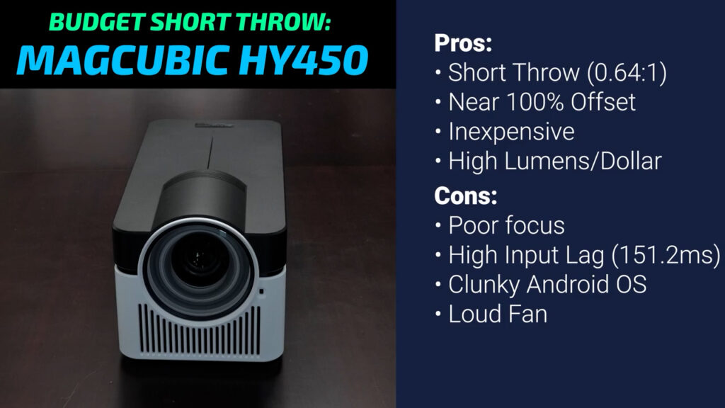 An honorable mention has to go to the Magcubic HY450 for doing something completely different. I love the short throw and 100% offset and I think it would make a great projector for someone looking to build a budget golf simulator and would be perfect for doing projection holiday decorations. At $139, it’s the most lumens per dollar of any of the projectors in the video, but I think I’d recommend paying the extra $10 to get the NetRange version of the projector instead of the Android version like I tested. Be aware that it does have a decently loud fan at 47.2 decibels and the speakers are usable, but definitely not great.