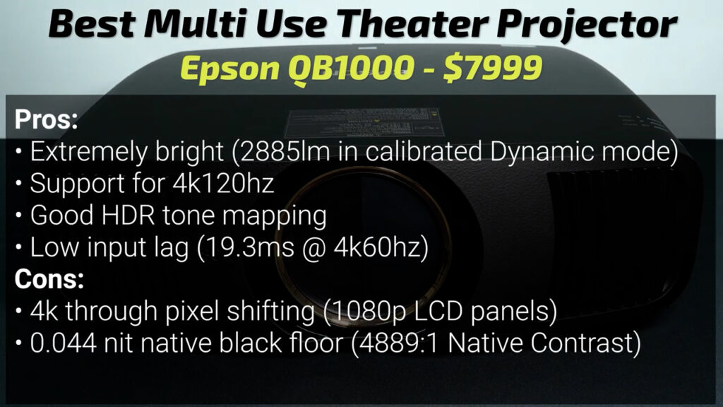 If you need or want more brightness, I was also very impressed with the Epson QB1000. While $7999 is still a lot to pay for a pixel shifter with 1080p panels, the performance is on par with other projectors at and above that price point. So, if your theater is more of a multi-purpose room without black walls and ceiling, or if you just want to project a massive screen, you’ll appreciate the extra brightness of the QB1000 over the NZ500.