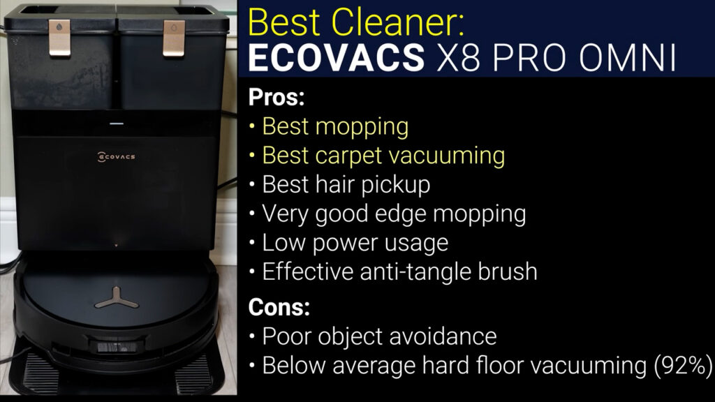 If you just want the best cleaner, the ECOVACS X8 Pro OMNI had the best mopping, best carpet vacuuming, and best hair pickup and tangle avoidance but had the worst object avoidance score and the worst hard floor vacuuming score, which to be fair was still over 90%.