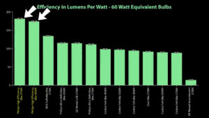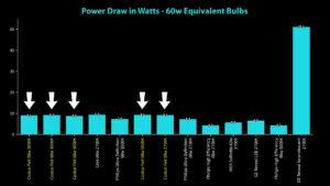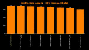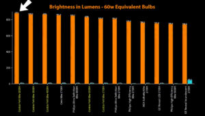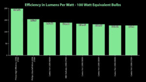 For the 60W equivalent bulbs the Costco Feit Electric bulbs were the brightest with around 870 lumens, but they did draw significantly more power than the rest of the bulbs at around 9.2 watts average. While the most efficient bulbs were predictably the Philips High Efficiency model that topped the charts at 181 lumens per watt for the soft white, and 174 lumens per watt for the daylight version, which means that they’d have a yearly operating cost of less than $1 based on three hours a day and 20 cents per kilowatt hour.