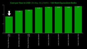 And for the 100W bulbs the Feit Electric bulbs from Costco topped the list for brightness again at 1759 lumens for the 3000K color temperature, but the Philips Ultra Definition was close behind at 1751 lumens, and for efficiency both of the Philips bulbs came out on top with the high efficiency model at 198 lumens per watt, and the Ultra Definition model at 153 lumens per watt, for a yearly operating cost of $1.77 and $2.50.