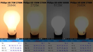 Separate from color temperature, a major difference between cheap bulbs and high quality bulbs are their ability to accurately show the natural colors of an object, which is called their color rendering index or CRI, and for the most part all of the bulbs in this video did a great job compared to the cheap no-name bulbs from my last video, but some notably great performers were the YUJILED bulb with 97.6 CRI and the Philips Ultra Definition series which all ended up at the top of the list with the 75 watt version doing the best with 97.1 CRI, then the 100 watt, and then the 60 watt daylight and soft white versions.