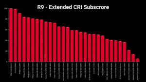 CRI specifically measures colors from R1 to R8, but extended CRI includes other more vibrant colors and one in particular, R9, is typically hard for LEDs to render but is important for accurately lighting human skin tones, and you can see that the YUJILED had an excellent R9 subscore of 99, while the Ultra Definition and High Efficiency bulbs from Philips also had very respectable R9 scores between 80 and 91.