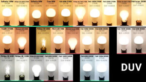 with the greenest tints first, neutral whites in the middle, and pinkest tints last, and you can see the Philips Ultra Definition 60W soft white was extremely close to perfectly neutral with a slight pink tint while the Feit 200W, Feit 100W, YUJILED, and Philips Ultra Definition 75W were also extremely close to neutral with very slightly positive DUV values.