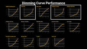 Speaking of dimming, I also tested each bulb’s dimming curve using a standard Lutron dimmer from Home Depot, and the results were interesting. Human perception of brightness is logarithmic, meaning going from 500 lumens to 2000 lumens will only appear twice as bright to our eyes, and as a result you want the dimming graph to be curved, not straight, and the brightness at 100% should be about four times the brightness in lumens at 50%, and both of the 60W Philips Ultra Definition bulbs and the Feit Electric 60W bulbs had almost perfect dimming curves as well as a minimum stable brightness under five lumens.