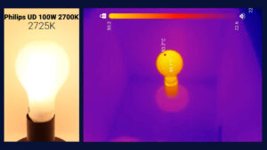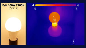 In my testing I’ve found that glass bulbs with COB LED filaments run significantly cooler than the aluminum and plastic bulb design, and you can see that after an hour of usage inside the Styrofoam enclosure the Glass Philips Ultra Definition 100W bulb was just 50.6 degrees Celsius at its hottest point, while the 100W Plastic Feit electric bulb was significantly hotter after one hour with parts of the base reaching close to 90 degrees Celsius, which again could lead to premature component failures since they’re often only rated to around 100 degrees.