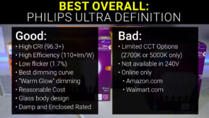 Unfortunately, Philips makes different bulbs for 120V and 240V markets, so if you live in Europe you can’t buy these exact bulbs, but I think the closest match for the Ultra Definition series is the Philips Premium Line, and you can definitely get the same Ultra Efficient bulbs that had very decent CRI and zero flicker, but it looks like neither of those bulbs are dimmable in the European market.