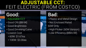The 60W Feit bulbs from Costco had more flicker than I’d like but had very decent CRI and brightness especially for $1.67 each, while the 100W Feit bulbs had much better flicker and efficiency with the tradeoff of higher cost. Unfortunately, while they do specifically say they are damp rated, neither the 60W or 100W boxes say anything about enclosed fixtures or downlighting, and the older style plastic and aluminum construction tends to get much hotter than the newer all glass design, not to mention the fact that the glass bulbs do a much better job of evenly lighting an area rather than just emitting light in a single direction.