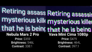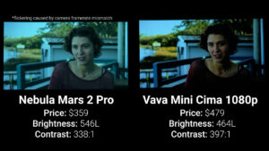 Round 1 was the Mars 2 Pro on the left and the Vava Mini Cima 1080p on the right, and there was no question that the colors on the Vava were more saturated and vibrant, but shadow detail was completely non-existent and in the darker scenes the Vava was basically unwatchable.  The other huge issue was that the Vava Cima 1080p looked lower resolution than the 720p Mars 2. I backed out to the menu to see some text and the Vava is very clearly not 1080p.  There is a setting to enable or disable “HD Video,” which I’m guessing controls the pixel shift mechanism, but I couldn’t see any difference after toggling that switch, so either my unit is defective or this is a firmware issue. Either way, the 4 year old Mars 2 Pro easily won this round.