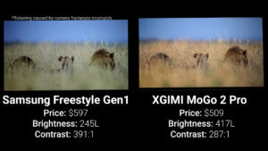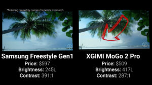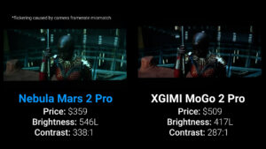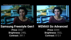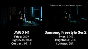 That put the Freestyle Gen 1 on the left up against the Mogo 2 Pro on the right for round 3, and for relatively modern projectors I didn’t think either of them performed particularly well with the Freestyle’s image being over sharpened and over saturated and the Mogo 2 Pro lacking contrast.  The deciding factor was during HDR playback when the tone mapping on the Mogo 2 Pro went crazy on the highlights resulting in terrible color banding and blocking.