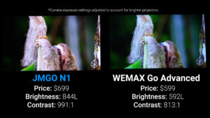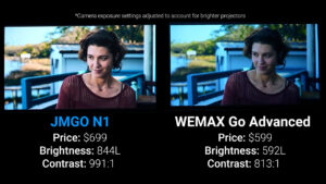 That means that overall, the brightest projectors were the Nebula Mars 3, LG PU700R, and GP100A. While the highest contrast projectors were the JMGO N1, WEMAX Go Advanced, and XGIMI Halo Plus.