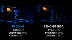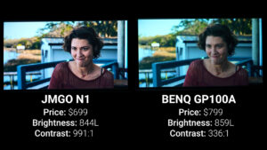 So in round 7 the JMGO N1 on the left is up against the BENQ GP100A on the right, and the color on the BENQ was spot on, extremely true to the source, and the brightness between the two projectors was also very even, making this the closest round yet with the BENQ favored in bright scenes and the JMGO’s contrast ratio and tone mapping giving it an advantage in dark scenes, and as I explained in round 2, I think that for a portable projector the JMGO has the advantage since it will look better in less than perfect viewing conditions, but both of these projectors are definitely at the top of the list so far.