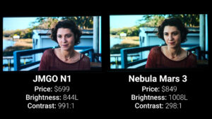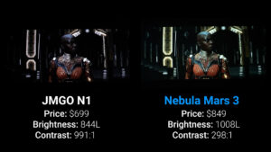 Moving on to Round 9 the JMGO is on the left and the Nebula Mars 3 is on the right, and the Mars 3 is such a great successor to the Mars 2 Pro, carrying on everything that the Mars 2 Pro was good at but improving it even further. Like the JMGO the Mars 3’s noise reduction settings are way too high out of the box resulting in unnatural smoothness in skin texture, and the Mars 3’s significantly lower contrast was definitely noticeable, but as the kids these days would say, Nebula understood the assignment when it comes to the Mars 3, and while the low gamma value wouldn’t be good for a dedicated home theater, it makes a lot of sense for a projector you’ll be carrying around with you and projecting onto random imperfect surfaces in less than ideal conditions, and in the context of a portable projector I think the Mars 3 is the obvious winner in this round producing a clear easy to watch image no matter what the source.