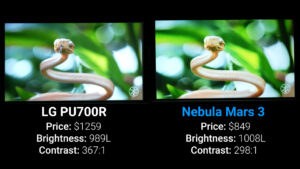 So the final round then put the least portable projector, the LG PU700R on the left versus the most portable projector, the Nebula Mars 3 on the right, and in bright SDR content the LG’s color accuracy was very good and the image was true to the source, but in darker scenes and HDR content the LG fell flat compared to the Mars 3 which, while not perfectly true to the source, produced an image that was extremely easy and enjoyable to watch, making it the winner of the viewing experience testing for 2023.