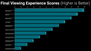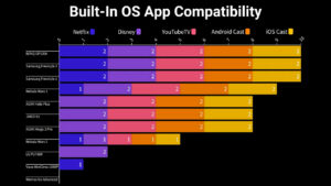 Another thing that I wouldn’t normally place a lot of emphasis on but becomes more important for a portable projector is the capabilities of the built-in operating system.  Depending on the age of the projector and type of operating system, app compatibility can vary significantly, so I tested 3 of the most problematic apps: Netflix, Disney+, and YouTubeTV as well as iOS casting and Android casting and awarded 2 points for complete compatibility, 1 point for work around compatibility, and zero points if the app didn’t work, or didn’t work properly.