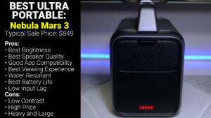 The Nebula Mars 3 is huge and heavy at just over 10 pounds, but to me it encompasses everything a portable projector should be. It’s bright at over 1000 ANSI lumens, even on battery, has great built-in speakers, almost perfect app compatibility, the projector settings are tuned for less than perfect viewing environments, it’s rainproof, and overall just has a rugged build quality.  If you’re looking for a camping projector or outdoor movie night projector, the Mars 3 is as good as it gets.