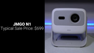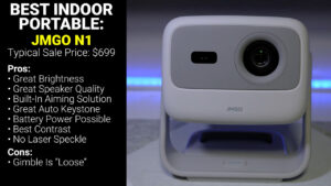 Following that up for a street price of around $700 is the JMGO N1. This is not the N1 Ultra or N1 Pro, but a smaller white version that includes 1080p resolution and JMGO’s MALC triple laser light source running at much lower power. The N1 doesn’t have a built-in battery, but as I’ll explain later can run extremely well from a USB battery bank using a $15 third party cable.  Like its bigger brothers, the N1 includes an Android 11 operating system with auto focus and auto keystone to complement its built-in aiming mechanism, although if you’re used to the flawless aiming and auto keystone of the N1 Ultra the comparatively sloppy gimble and keystone of the N1 will be a bit of a letdown.