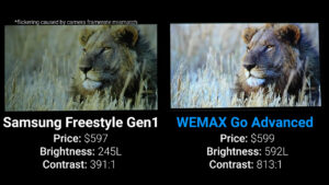 So, the Freestyle Gen 1 on the left moves on to round 4 against the Wemax Go Advanced on the right, and just like last year the Wemax Go Advanced was a breath of fresh air, producing a bright, vibrant, relatively color accurate image with good tone mapping, good contrast, and good clarity. Significantly better than any of the projectors we’ve seen so far, easily beating the Freestyle and moving on.