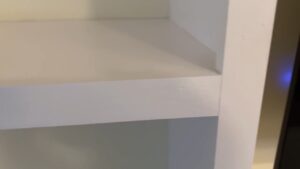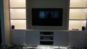 I also wanted to keep the Gledopto controller, power supply, and wiring hidden. My friend has an AV receiver that’s going to be on the bottom shelf with a shelf above it to keep all the speaker wires and power cords hidden, so that was the perfect spot to run all the wires from.