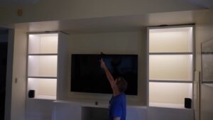 On day 2 I moved onto LED lighting. Usually for a built-in cabinet like this I’d recommend using analog, non-addressable LEDs since they tend to get brighter and have a better color rendering index, but because I’m also installing a projector and screen and because my friend loves using his current Govee immersion system, I wanted him to have the option of using all the cabinet lighting as a screen extension. I went with WS2814 12V RGBW addressable strips that are controllable in groups of three but still have a nice dedicated 3000K white LED with a respectable CRI of 92.1.