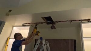 At the beginning of day 3 I started one of the coolest parts of this project but for sure the hardest, the recessed motorized 100” projector screen from Elite Screens. The thing that made this difficult was the fact that the overhang on either side of the screen housing was slightly less than half an inch, so there wasn’t a lot of room for error when cutting a hole in the ceiling. After taking some measurements of the screen, I started marking out the positioning on the ceiling.