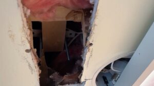 Unfortunately, there wasn’t any attic access to this part of the house, so my only option was to cut a person-sized hole in the ceiling, revealing mostly what I was expecting, which was 2×4 blocking toe-nailed to the 2×6 ceiling joists to hang drywall. So, I added a 2×4 top plate to each of the existing 2x4s and then used a laser line to mark a conservative cutout for the screen, removed all the drywall I could, and then used a reciprocating saw with a 4” blade to cut the old 2x4s without cutting my new top plates. At the end of day 3 it was clear that the screen was going to be a two-day project, but I did succeed in cutting a big ugly hole in my friend’s ceiling.