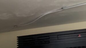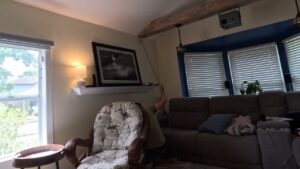 Next step was moving on to the projector and there was a nice beam across the room to work with. There were two things I need to take care of. The first was needing power for the projector. There were lamps already installed in the beam, so I stole power from them. The second was I needed to run a very long HDMI cable from the projector to the back of the receiver in the built-ins. I got very lucky that my friend had installed height channel Atmos speakers in the corners of the beam, and he had already run the speaker wire through the wall and down to the floor. So, I tried to use a pull cord on the speaker wire and pull it down through the same hole he already made, and then I could pull the speaker wire and the HDMI cable back up the wall.